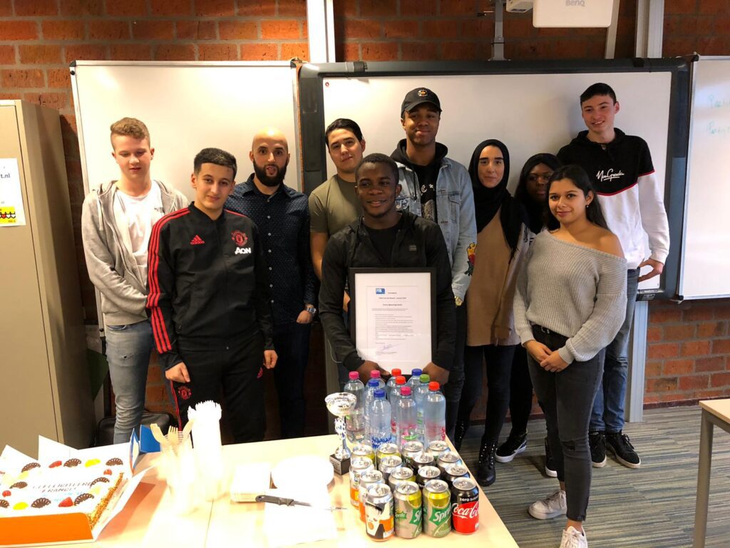 Studieloopbaanbegeleider Mohamed El Morabet heeft een grote slagroomtaart voor de klas besteld. Een mooie aanleiding om een feestje te vieren. “Weten jullie wie het Talent van de Maand januari is,” vraagt Margreet Rookmaker (College van Bestuur). Na afloop is het talent echt verrast. “Dit had ik niet verwacht. Wat leuk! Ik krijg zulke lieve reacties,” vertelt Francy.