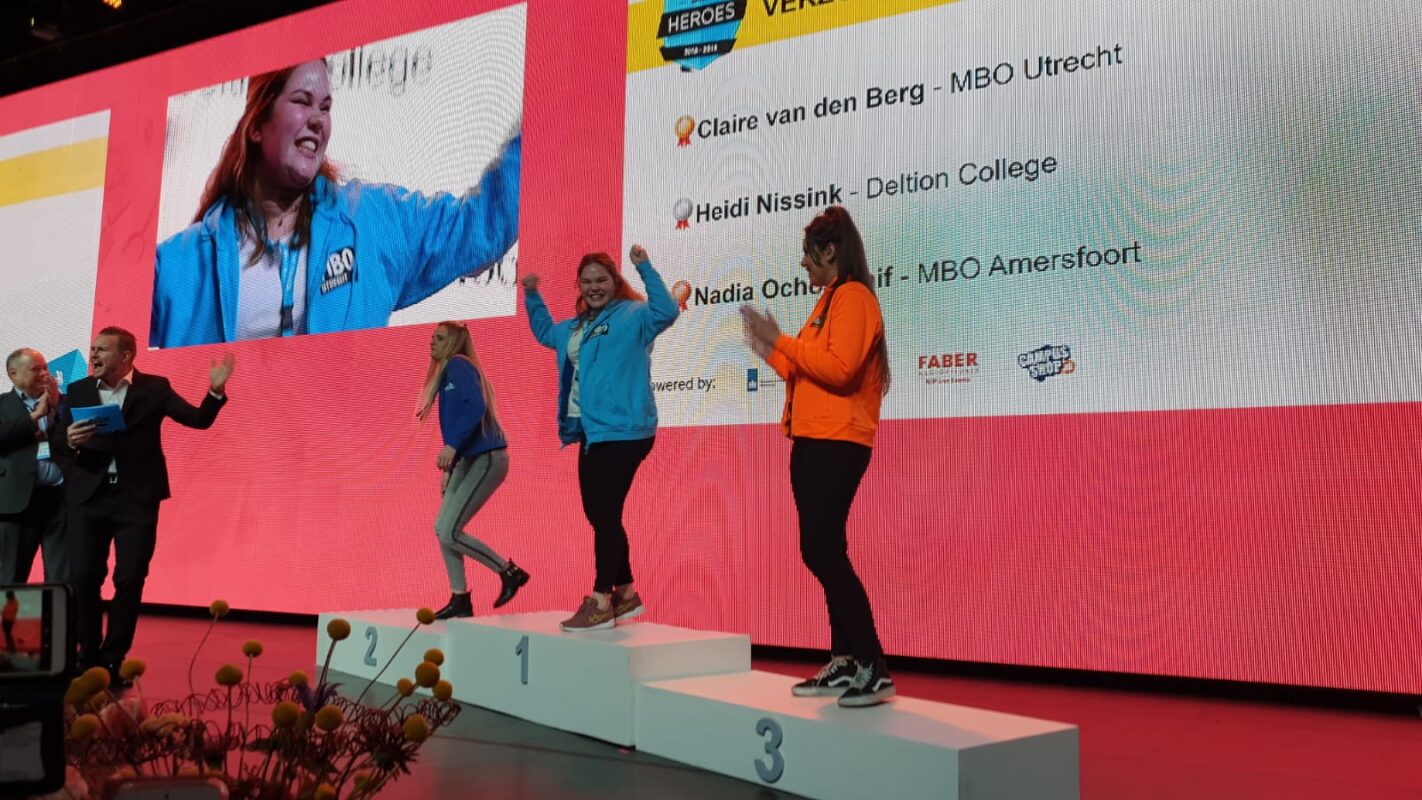 Student Claire van den Berg uit De Meern mag zichzelf de beste Verzorgende IG van Nederland noemen. Na een spannende finale van 20 t/m 22 maart in de RAI Amsterdam won Claire goud bij Skills Heroes, een jaarlijkse vakwedstrijd voor het mbo. Daarnaast mochten ook Emma (Onderwijsassistent) en Jelle (Verpleegkundige) het podium op, zij kregen een bronzen medaille.